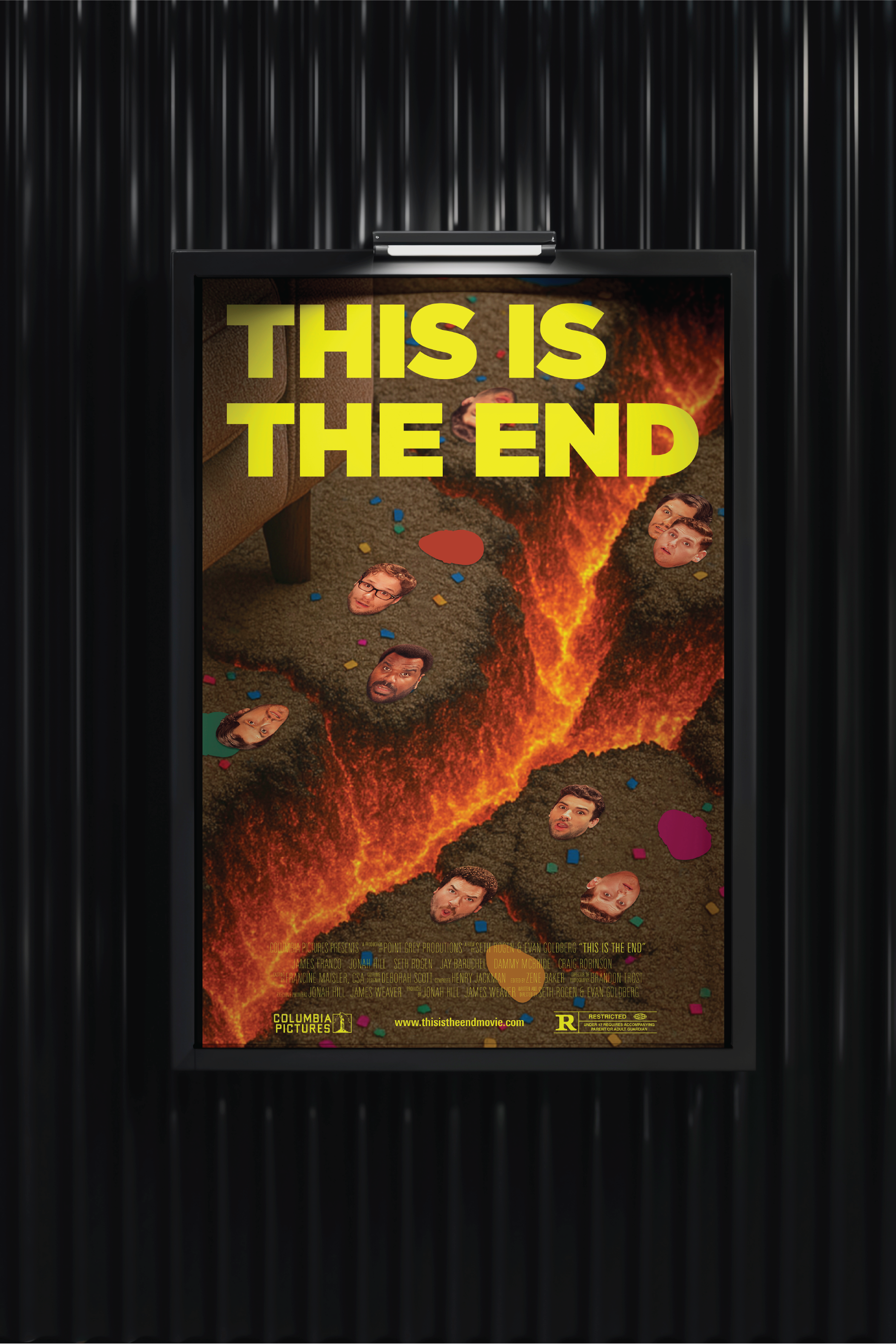 In this film, armageddon occurs during a rowdy house party. The confetti motif is a way to invoke the film’s setting and highlights the iconic and diverse comedic cast.